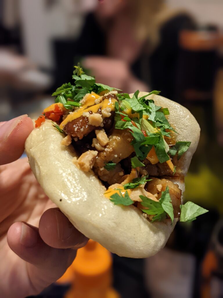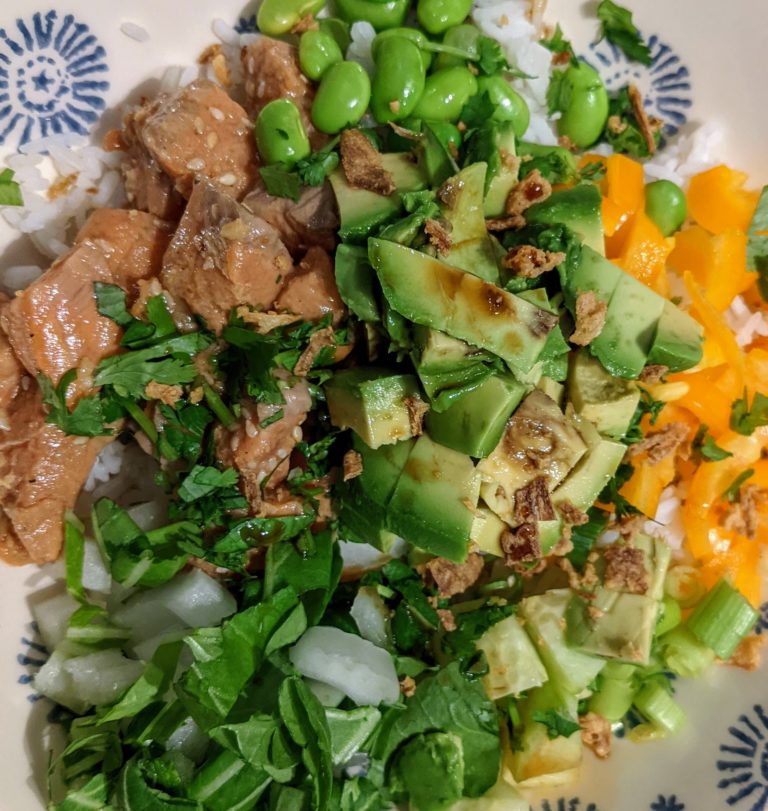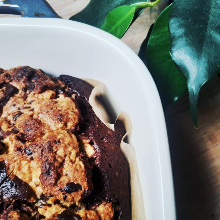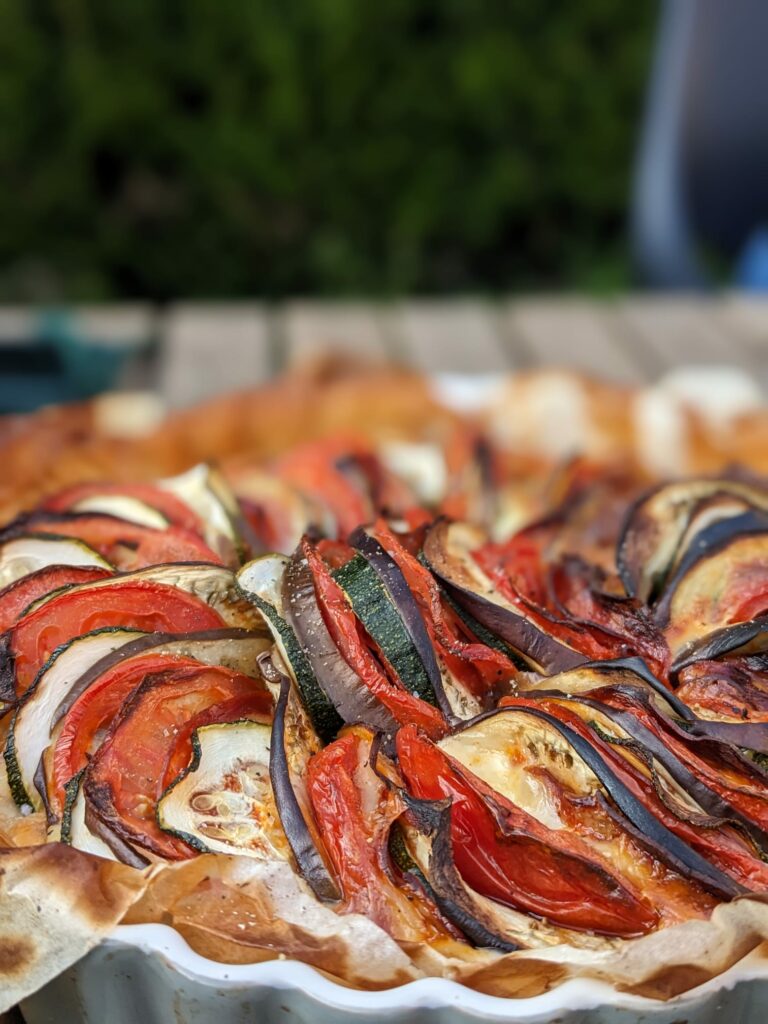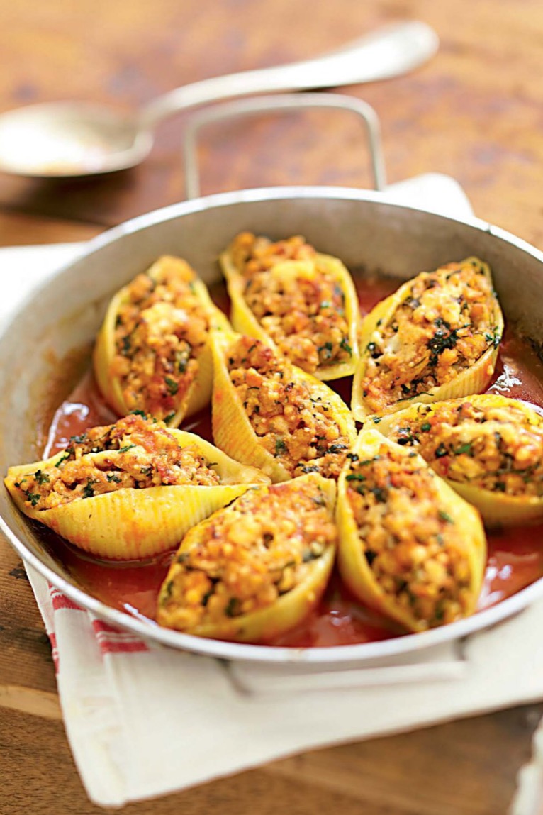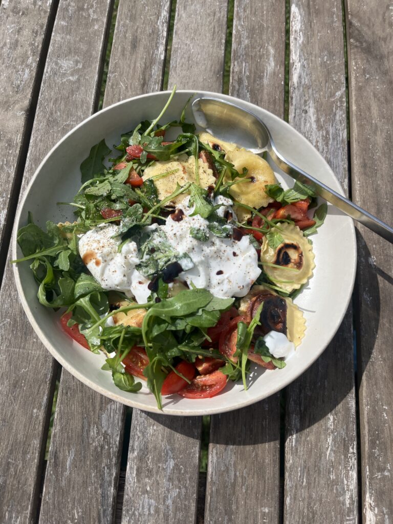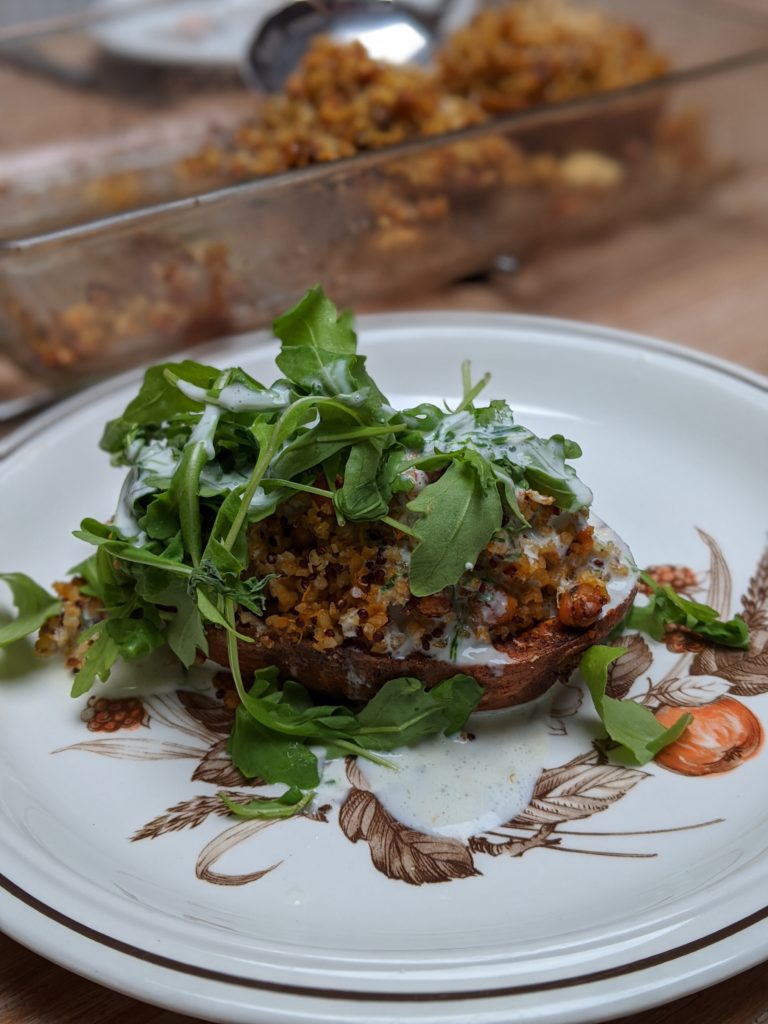 Patate douce farcie au quinoa , pois chiche croustillant, sauce au yaourt et roquette