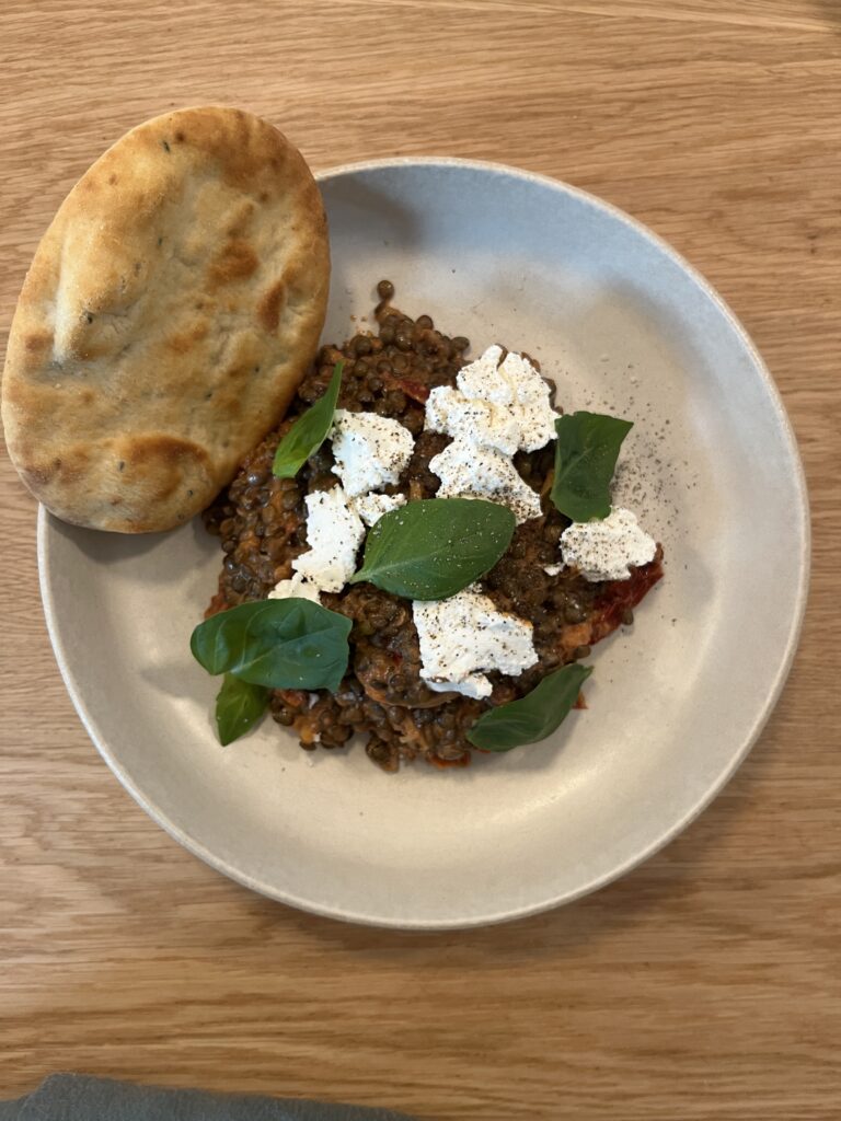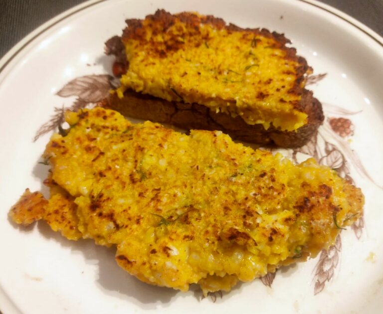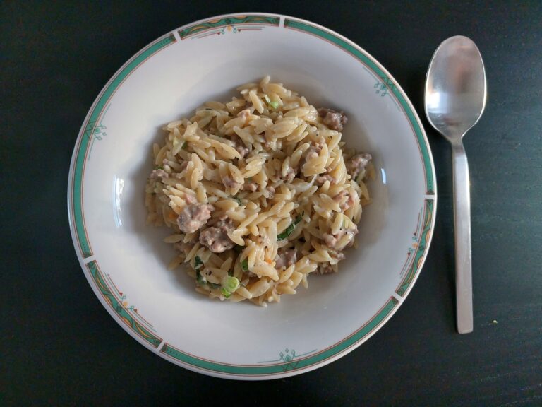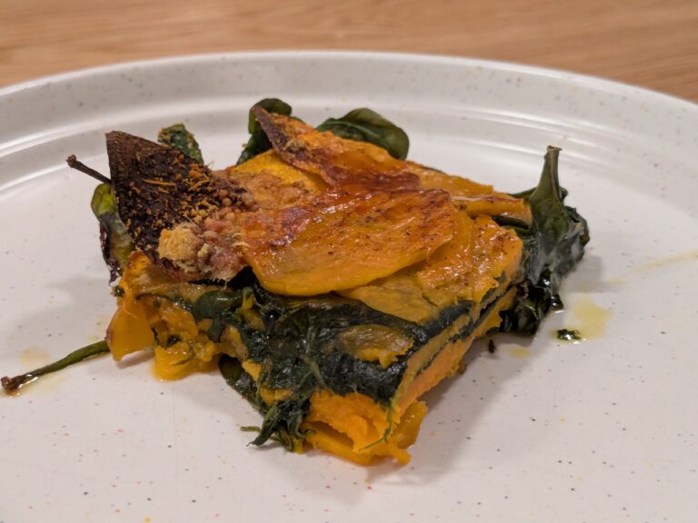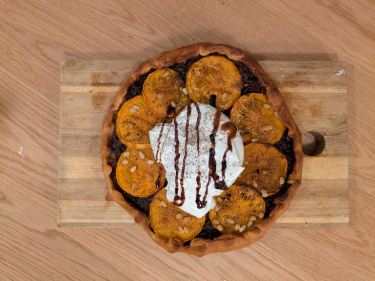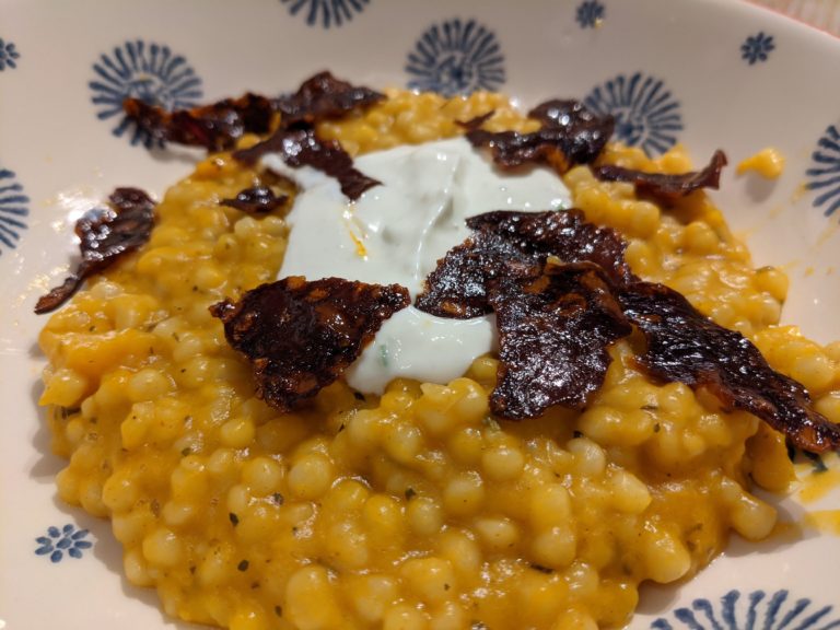 Risotto couscous perlé à la courge, chips de chorizo, ricotta citronnée